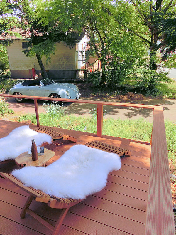 The cute little side table was a chunk of wood found on Amazon Japan, smoothed and varnished, with some short foldable metal legs from my local DIY store. I think the gentle curves of the table and chairs help to soften the straight lines and edges of the deck and house, no?
