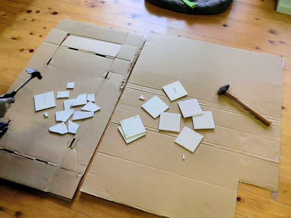 Hmmm. Mosaic tiles in Japan are stupid expensive, especially for an area this large. So I decided to make my own, and ordered a variety of pale blue and pink tiles from a Rakuten store online, then had some fun carefully smashing them into smaller pieces with a hammer!